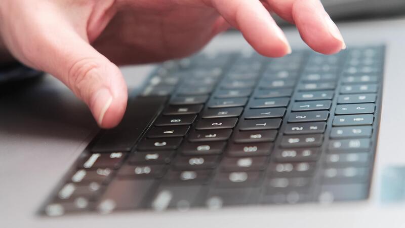 A close-up shot of a hand typing on a laptop keyboard, emphasizing digital communication, technology, and remote work. Pro Video