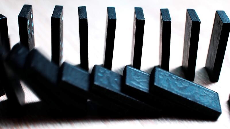 Close-up of Black Dominoes Falling in Sequence on Wooden Surface Showing Chain Reaction Dynamics Pro Video