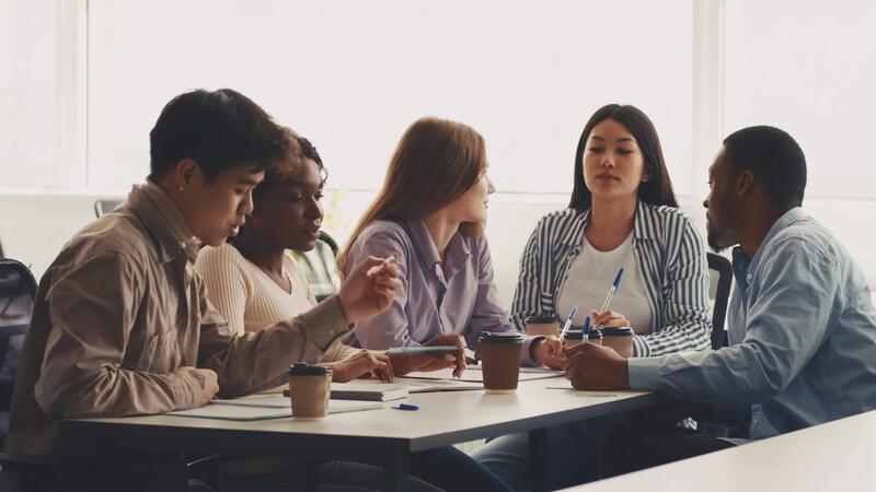 A group of diverse students engages in a collaborative study session at a university. They are discussing ideas and taking notes while seated around a table filled with notebooks and drinks. Pro Video