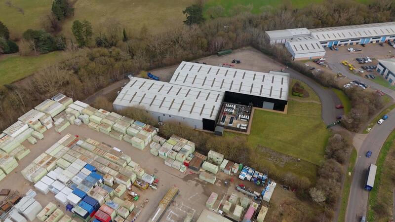 Aerial shot of advanced technology warehouse data center node with quantum computers Northampton Pro Video