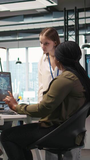 Vertical Smiling startup manager teaching junior dev how to use machine learning tech. Happy african american team leader showing intern in office how to use AI predictive models, camera A Pro Video