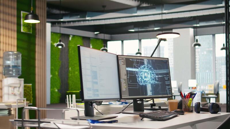Empty startup office with artificial intelligence program running on PC monitors used by programmers. AI industry startup workspace leveraging machine learning technology Pro Video