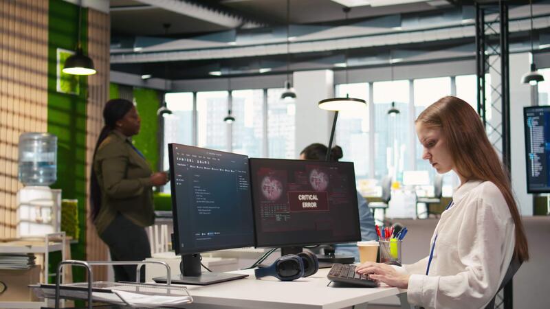 Young inexperienced developer in office struggling to fix critical error warning popup. Intern troubleshooting error notification on computer screen interrupting workflow, camera A Pro Video