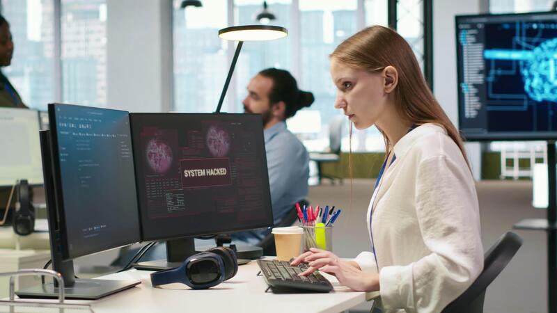 Young inexperienced developer in office requests help from team to fix hacking attempt on corporate network. Intern assisted by colleagues to investigate unauthorized access alerts, camera A Pro Video