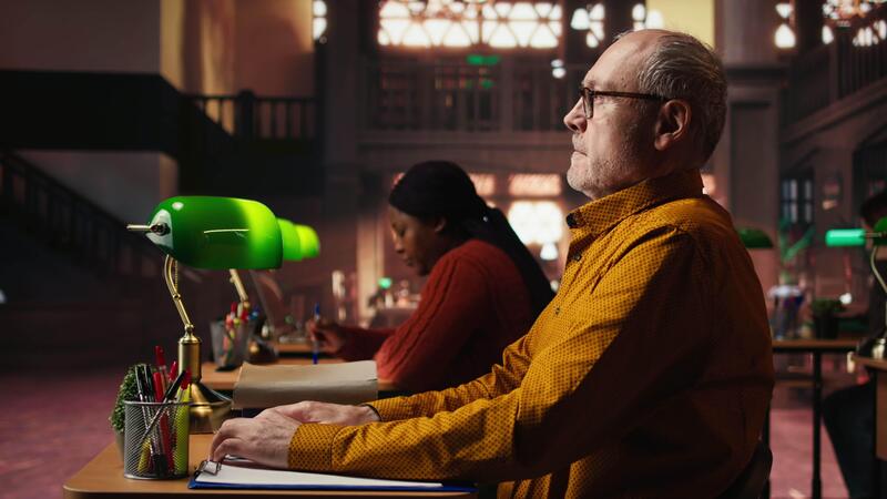 Elderly man with a respiratory problem having a panic attack in the library, struggling to learn due to a discomfort or breathing issue. Senior person in distress, hyperventilation. Camera A. Pro Video