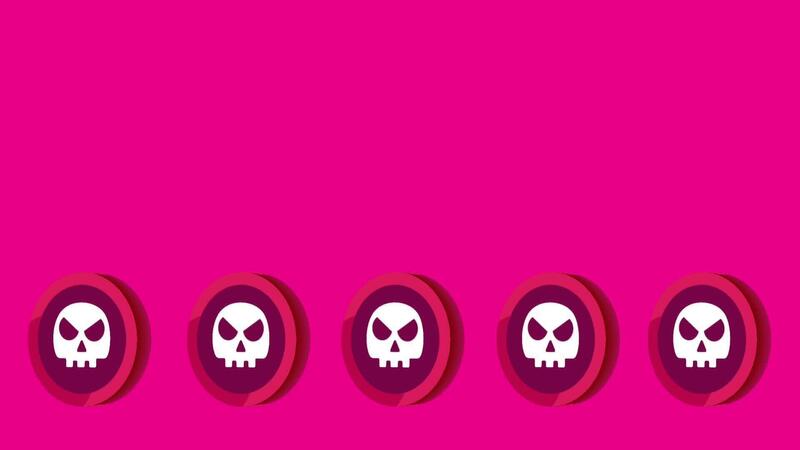 Five skull icons in a row over a pink background, representing tokens or danger elements in a colorful game interface style Free Video