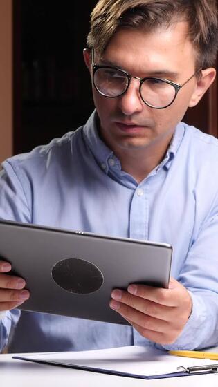 vertical Scientist using microscope and reading tablet in laboratory Pro Video