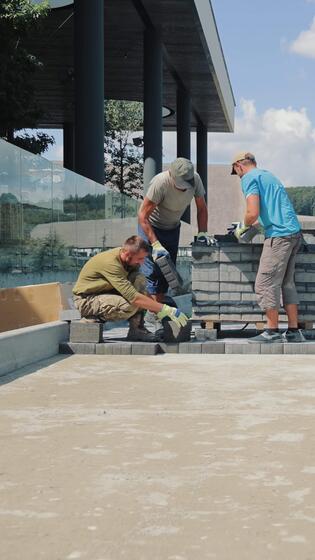 Workers professionally lay paving stones to create a decorative road. The process of building a stone pathway using square cobblestones by hand. Pro Video