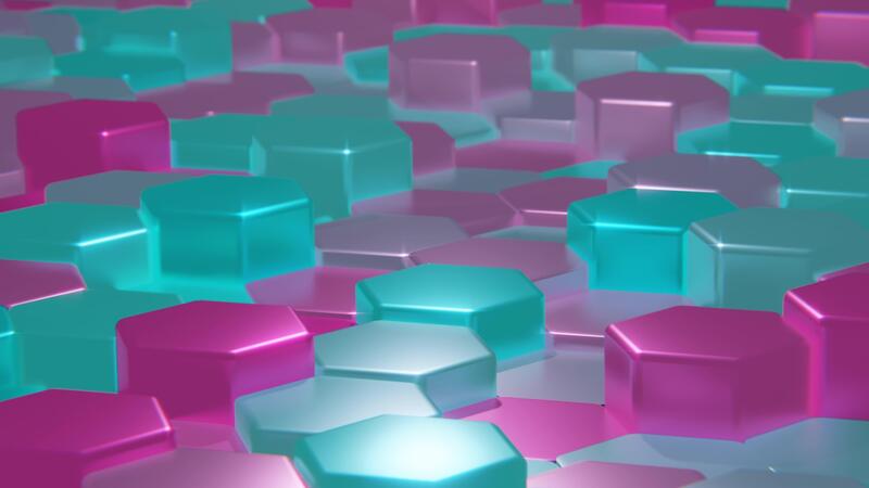 Abstract 3D background sci-fi hi-tech 80s retrowave seamless loop. Vaporwave synthwave videogame neon landscape with glowing cyan and pink hexagon texture. 4K 3D 30 fps Pro Video
