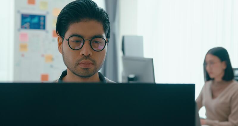 Closeup Asia male freelance write prompt AI bot IT app smart program nomad, game, terminal with coding language, user interface, designer, data center on desktop computer. Pro Video