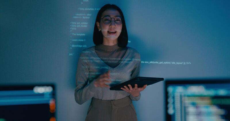 Asia female software developer mentor leader manager talk strategy plan to executive write prompt AI bot IT app program nomad, game, designer, data center. Projecting slideshow code. Pro Video