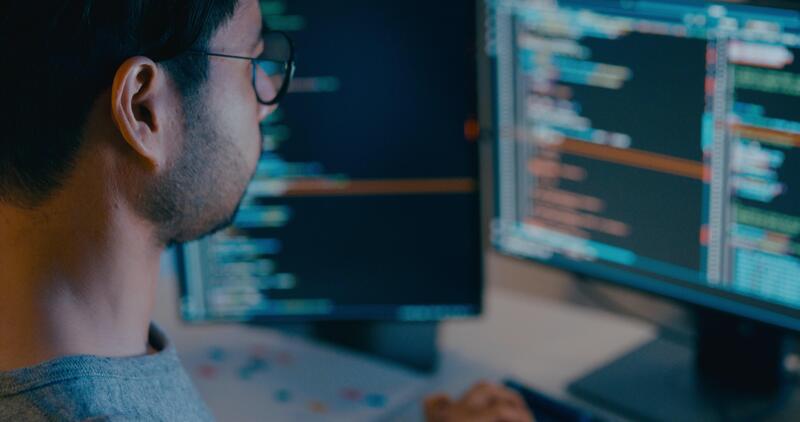 Asia male freelance typing write prompt AI bot IT app smart program nomad, game, terminal with coding language, designer, big data center on desktop computer in night office. Pro Video