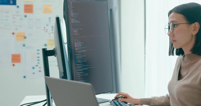 Young Asia female freelance eyeglasses typing write prompt AI bot IT app smart program nomad, game, terminal with coding, user interface, designer, big data center on desktop computer. Pro Video