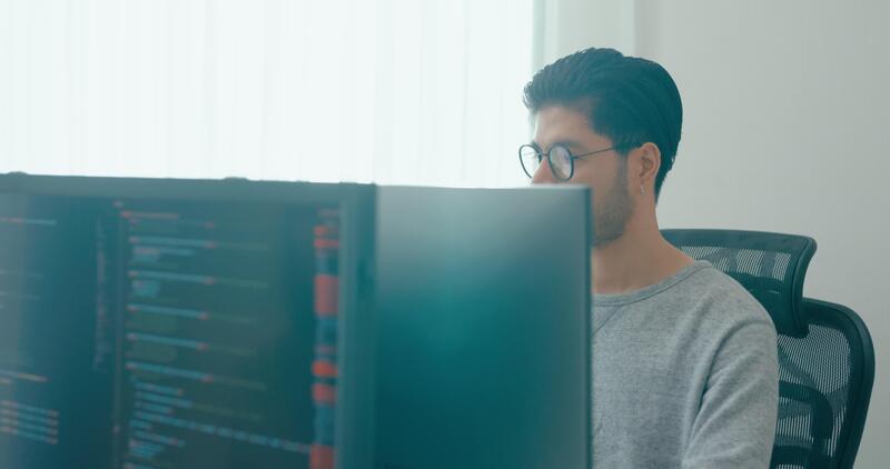 Young adult Asia male freelance eyeglasses typing write prompt AI bot IT app smart program nomad, game, terminal with coding, user interface, designer, big data center desktop computer. Pro Video