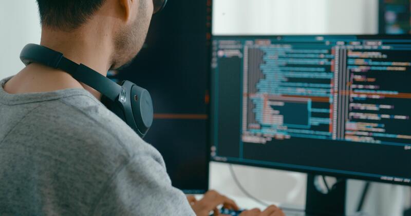 Closeup Adult Asia male, female freelance typing write prompt AI bot IT app smart program nomad, game, terminal with coding language, user interface, designer, big data center desktop computer. Pro Video