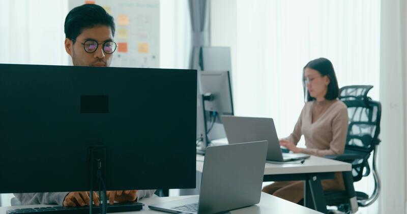 Asia male, female freelance typing write prompt AI bot IT app smart program nomad, game, terminal with coding language, user interface, designer, big data center on desktop computer. Pro Video