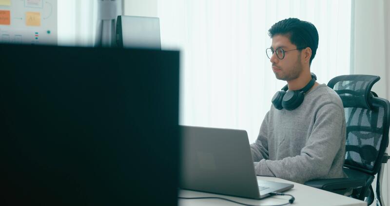 Group Asia male, female typing write prompt AI bot IT app smart program nomad, game, terminal with coding language, user interface, designer, big data center on desktop computer. Pro Video