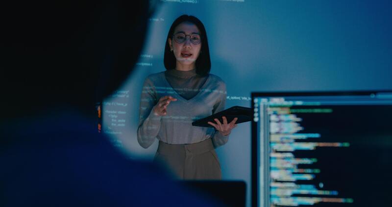 Group adult Asia female software developer mentor leader manager talk strategy plan to executive write prompt AI bot IT app program nomad, game, designer, data center. Projecting slideshow code. Pro Video