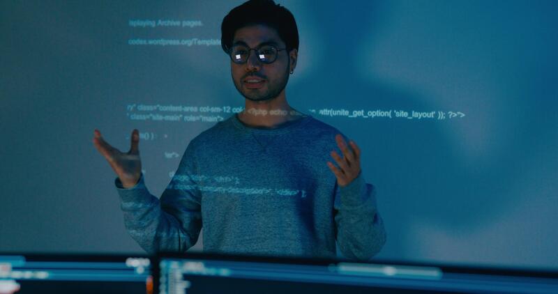 Asia male software developers mentor leader manager talk strategy plan to executive write prompt AI bot IT app program nomad, game, designer, data center. Projecting slideshow code. Pro Video