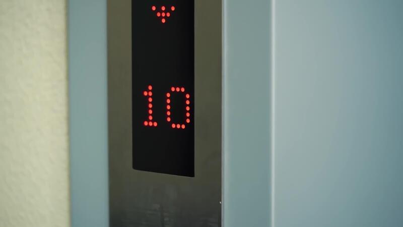 Elevator display with numbers in lightning red, going down. Close-Up of digital lift monitor showing floor number. Pro Video