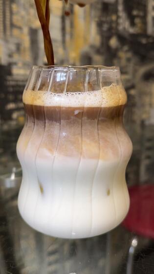 Ice coffee latte with cream being poured into it showing the texture and refreshing look of the drink, with a clean background. Pro Video