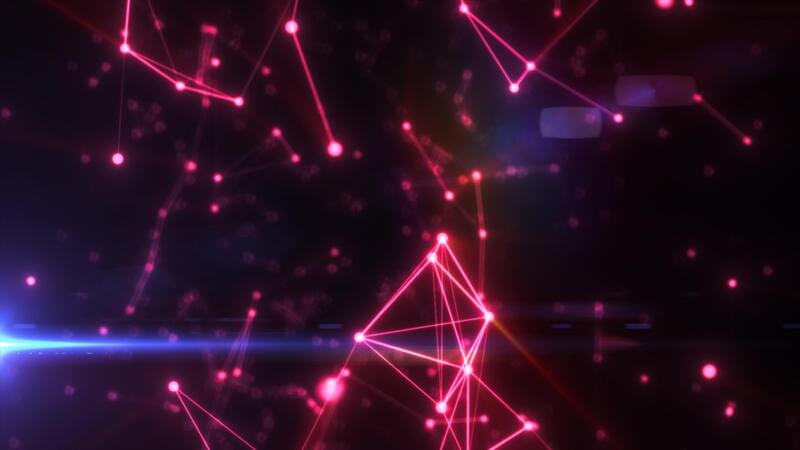 Glowing pink digital mesh of interconnected points on dark background with futuristic design elements and light flares Free Video