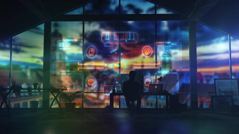 Programmer developing a brain-computer interface on a virtual display Pro Video