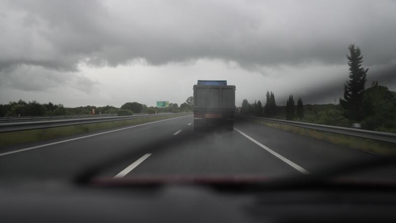 A truck is traveling on a highway surrounded by greenery and trees, with overcast skies and rain creating a moody atmosphere Pro Video