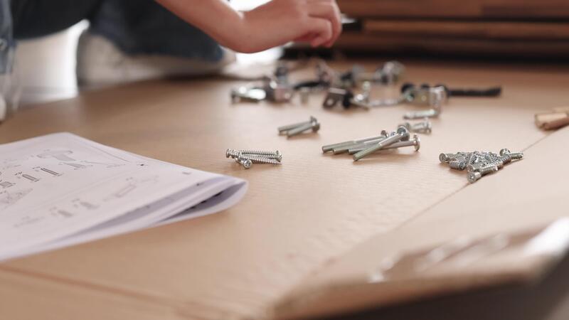 Hands sorting and assembling furniture pieces using nuts and bolts on a wooden table with instruction manual Pro Video