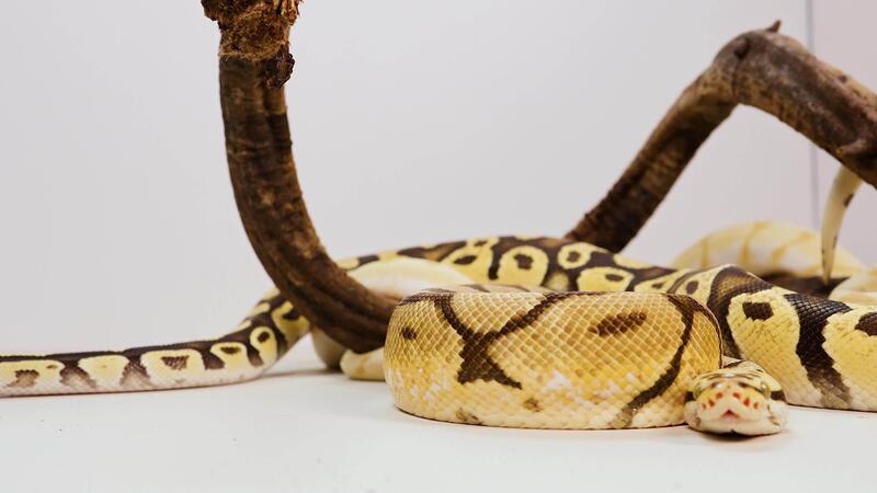 A ball python is coiled on a branch in a well-lit, indoor setting, showcasing its distinctive patterns Pro Video