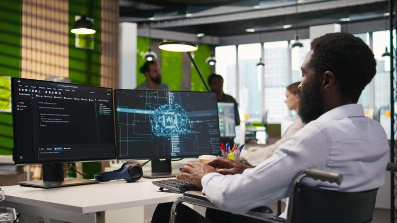 Technician in wheelchair using AI on computer to optimize performance and forecast issues. African american employee with disability in inclusive office training machine learning models, camera A Pro Video