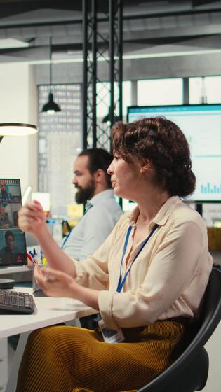 Vertical Woman engaging in discussion on call to share finance strategy details, using data analysis to create a briefing for reports. Building an effective partnership via conferencing. Camera A. Pro Video
