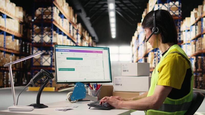 Call center employee assisting customers in a fulfillment center, handling inventory control and package tracking. Asian man resolving issues related to delivery delays or wrong addresses. Camera A. Pro Video