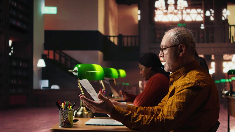 Experienced man rehearsing a theatre script in a quiet library, studying lines with commitment and emotion and practicing character development for role preparation. Acting skills. Camera A. Pro Video