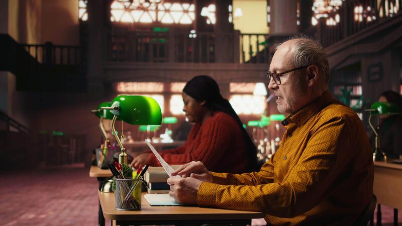 Aged man in a study area surrounded by library books and paperwork, preparing for university coursework and thesis writing with academic database materials at the campus. Camera A. Pro Video