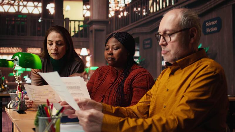 Multiethnic team of actors rehearsing their lines in the theatre library, showing commitment for role preparation and dramaturgy. Performers practicing dialogue with script. Camera A. Pro Video