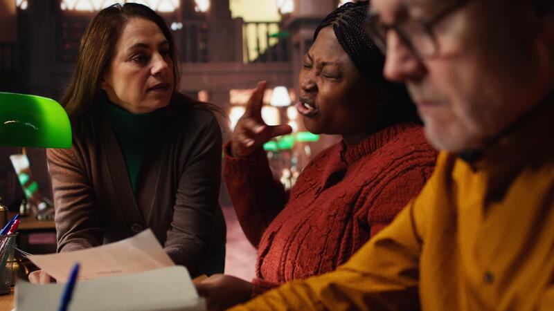 Diverse actors rehearsing dialogue and character expression in a quiet library, studying classic drama play lines with discipline and commitment. Theatre performance practice. Camera A. Pro Video