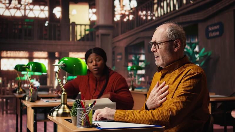Elderly college student does inhale exhale exercise due to physical discomfort, having a respiratory problem in distress at the library desk. Aged man unwell in distress. Camera A. Pro Video