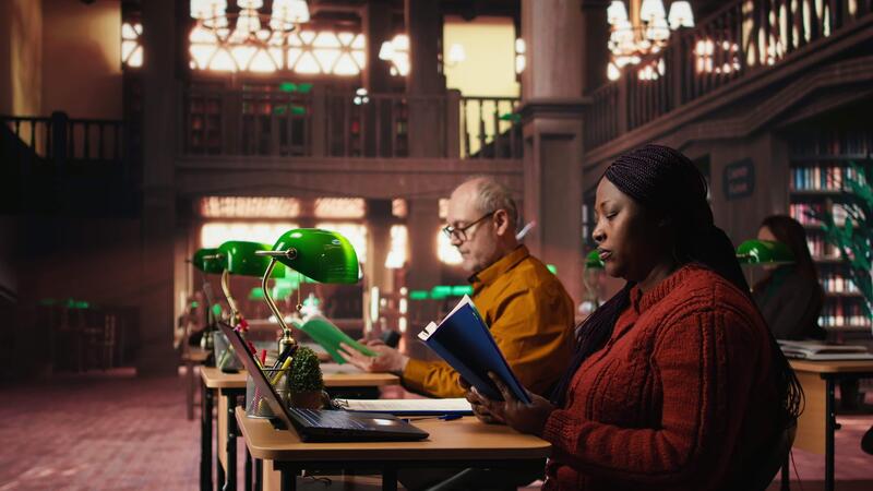 Black female student taking notes surrounded by books and study materials, preparing for a master dissertation and researching academic resources at the campus library. Camera A. Pro Video