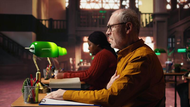 Senior adult in hyperventilation crisis feeling unwell in the campus library, having difficulty breathing and showing vulnerability. Old student having a panic attack emergency. Camera A. Pro Video