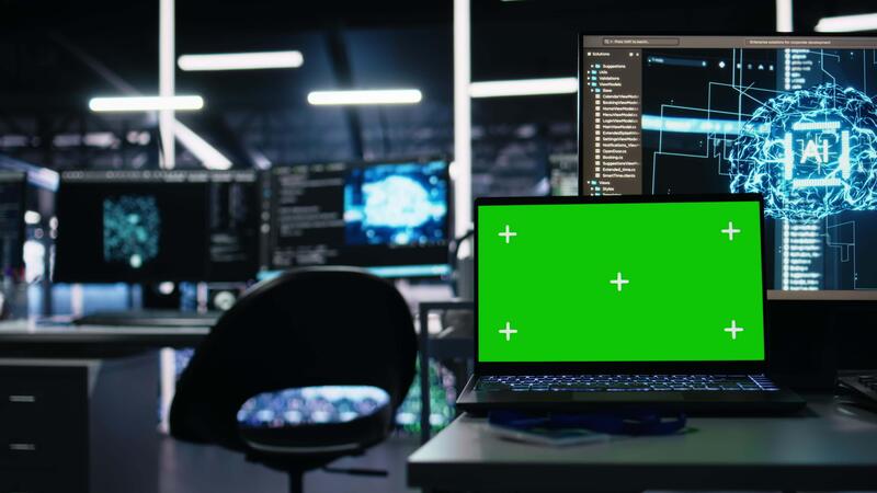 Close up of isolated screen laptop in data center used for AI development and machine learning coding. Server room chroma key notebook used for tracking neural network structures algorithm performance Pro Video