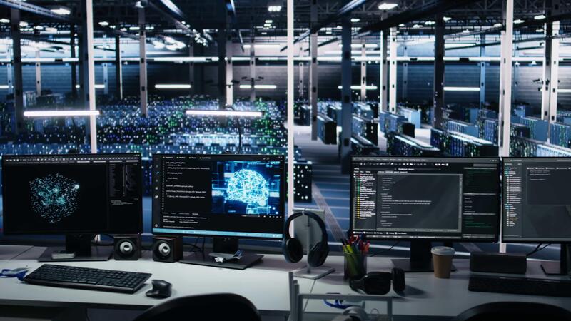 Data center PC screens monitoring backend hardware performance used in AI LLM model development and automation workloads. Workstation monitors overseeing server rigs equipment Pro Video