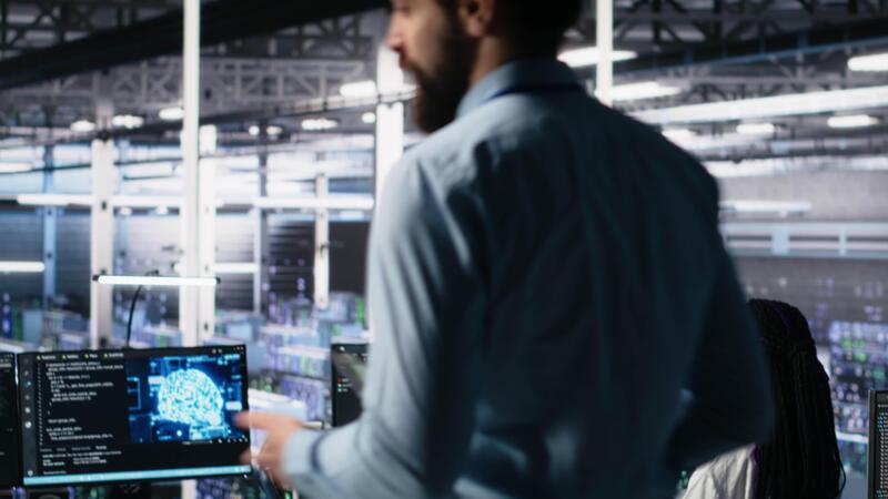 Man briefing investors on server room machine learning hardware. Data center supervisor filming AI tech presentation to shareholders, demonstrating predictive maintenance capabilities, camera A Pro Video