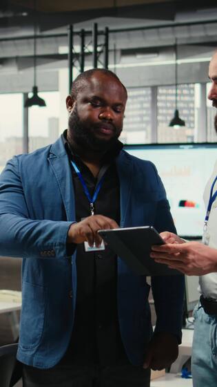Vertical Businessmen analysts monitoring efficiency insights at the workspace, utilizing analytics to plan forecast for detailed performance metrics and statements, business management. Camera A. Pro Video