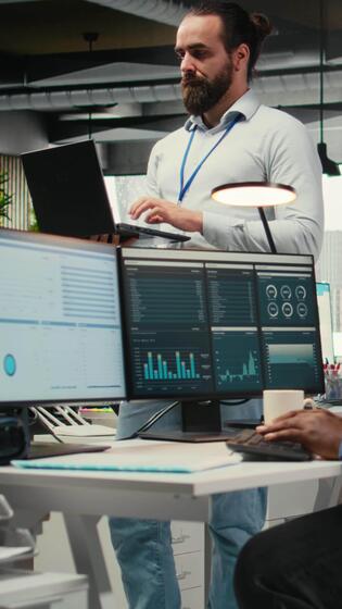 Vertical Office administrator completing daily tasks and monitoring work efficiency, utilizing data insights on infographics to generate performance reports and statements for management solutions. Camera A. Pro Video