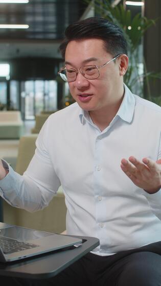 Confident businessman working on laptop computer in modern office lobby talk on online communication call with employee, boss. Manager man in shirt support services looking at webcam of computer Pro Video