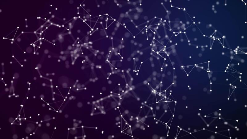 Looping animation of glowing dots and connecting lines forming a dynamic network mesh on a purple-blue gradient background, ideal for tech or digital concepts. Pro Video