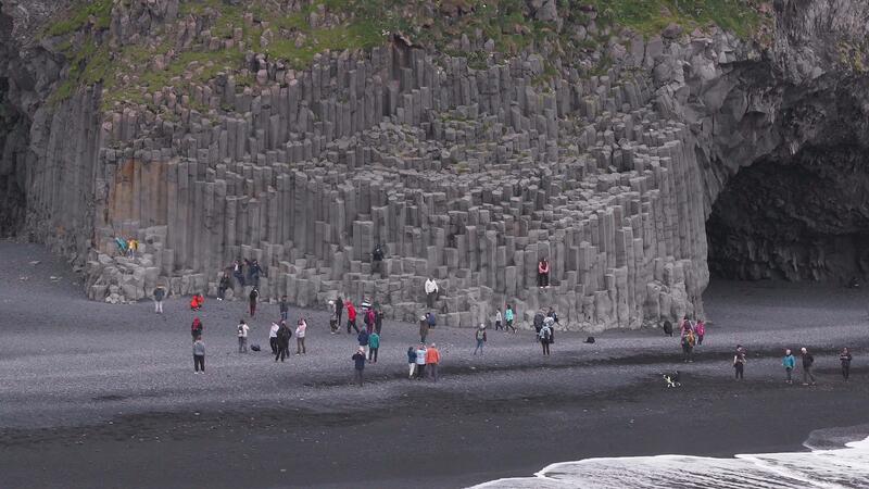 View of a black sand beach in Iceland with waves, rugged cliffs, moss patches, boulders, and visitors walking and exploring the area. Pro Video