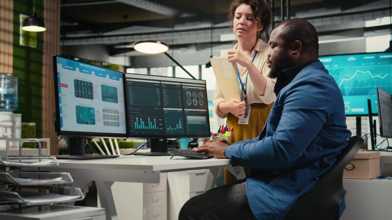 Colleagues engaging in discussion and consulting around performance metrics, leveraging insights to align objectives and achieve business goals efficiently in a multinational company. Camera A. Pro Video