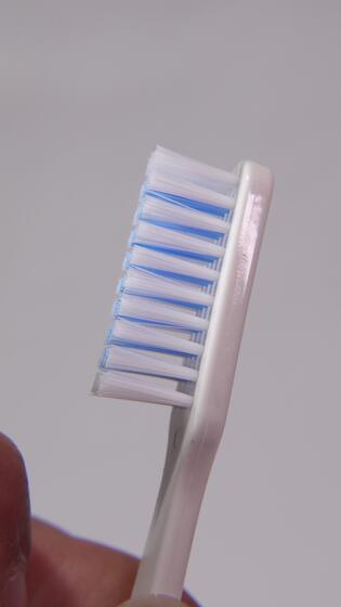 Detailed view of a finger gently pressing against the bristles of a toothbrush, showing the texture and flexibility. Toothbrush isolate background. Pro Video